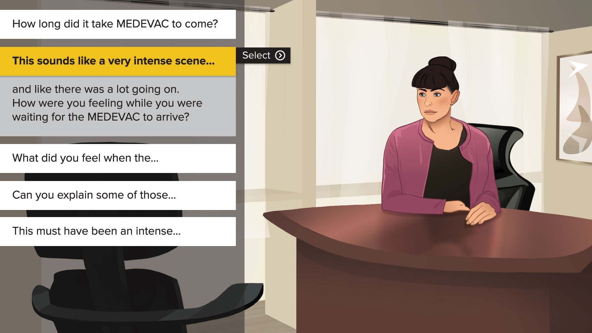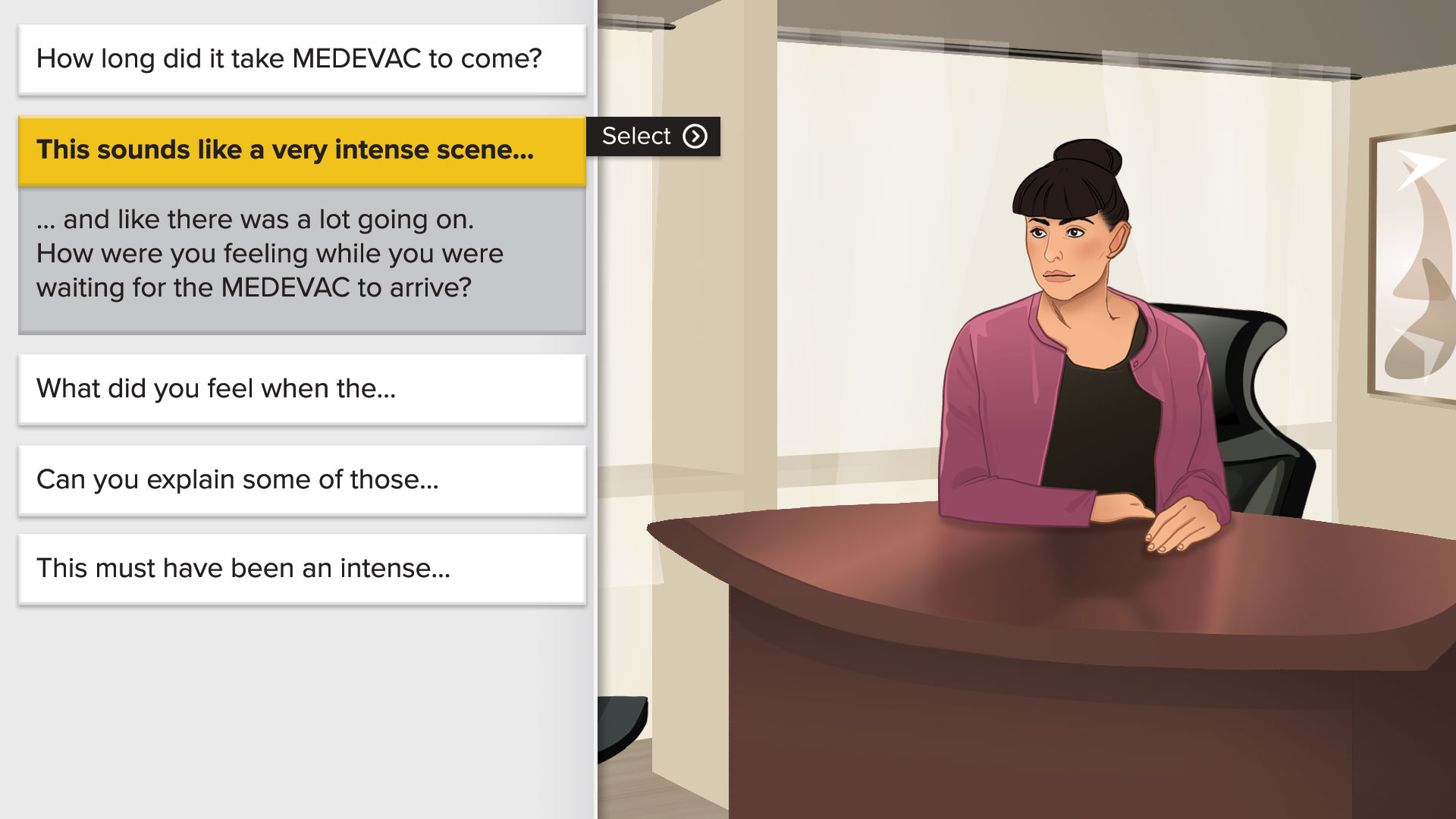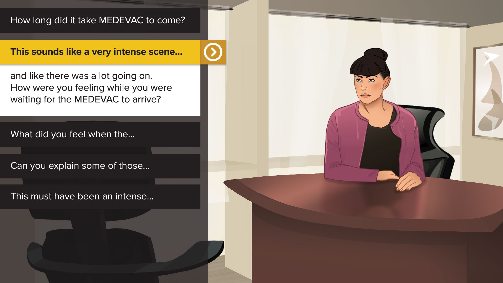 For the Trauma Management Therapy course, the UCF team wanted to include an interactive exercise for users to practice exposure therapy scene construction. For this purpose, we developed a conversation game where the user plays at a therapist working with a client to create a detailed account of a traumatic event.